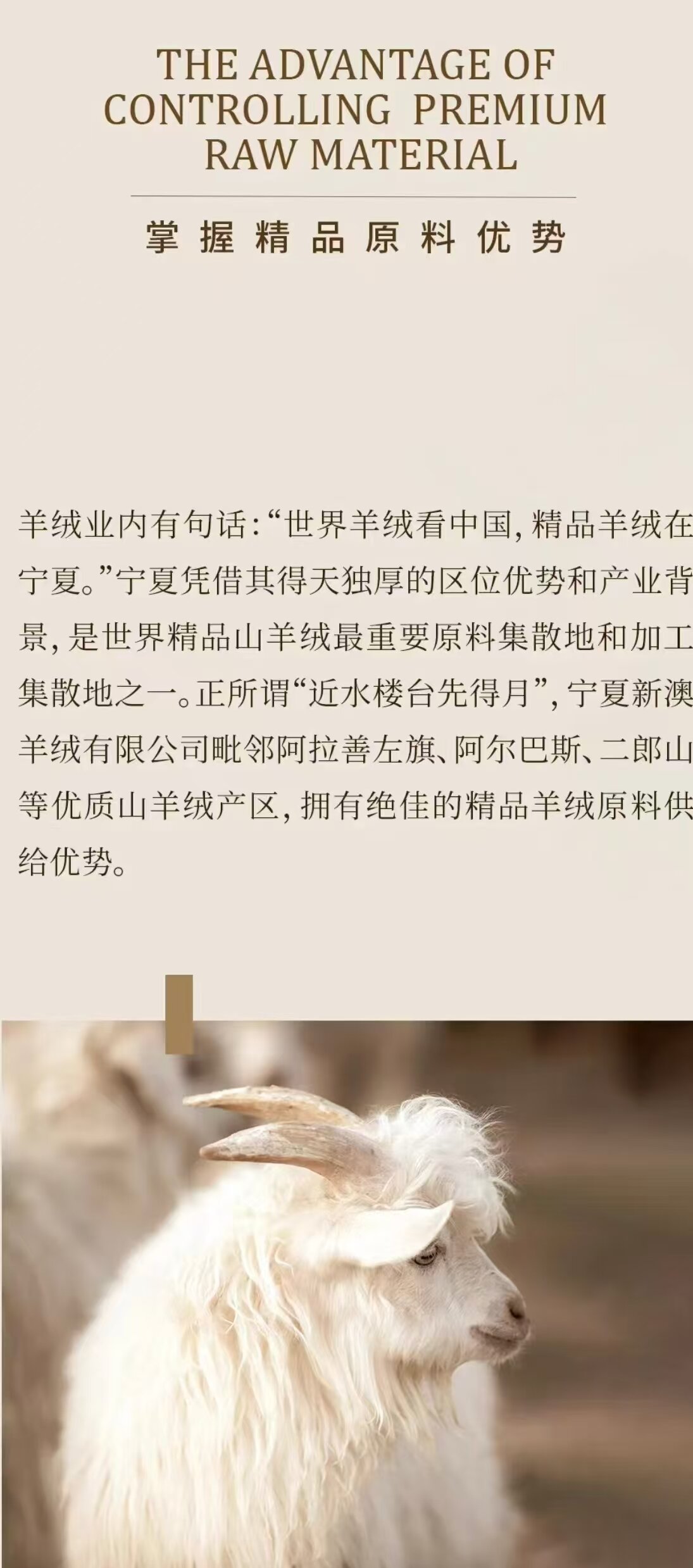 羊绒业内有句话:世界羊绒看中国,精品羊绒在宁夏。宁夏凭借其得天独厚的区位优势和产业背景,是世界精品山羊绒最重要原料集散地之一,公司拥有先进的羊绒技术专利,自主创新团队和完善的加工、采购、产品标准,助力羊绒技术及产品不断创新发展。