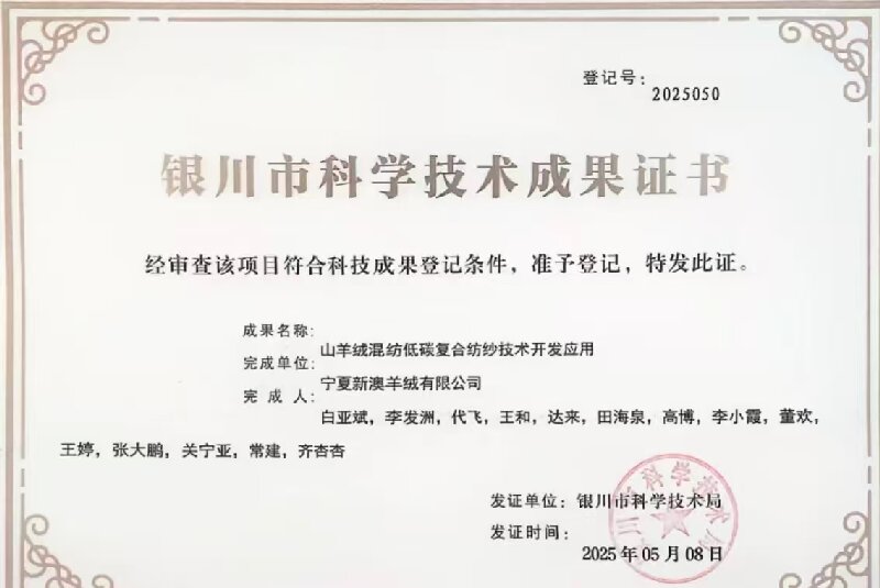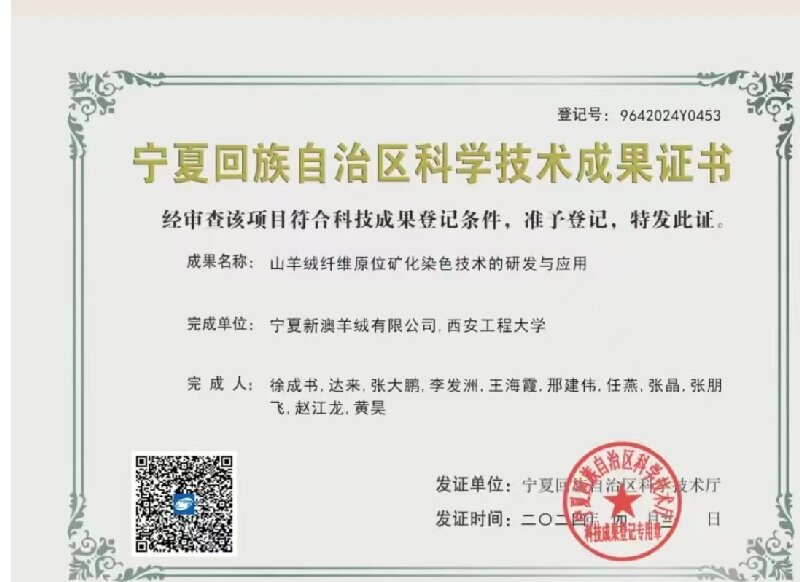新澳羊绒拥有先进的羊绒技术专利,自主创新团队和完善的加工,采购,产品标准,助力羊绒技术及产品不断创新发展。为保证每一根纱线的至臻品质,在科技研发领域,新澳羊绒持续加大投入。自2020年承接宁夏山羊绒技术工程技术研究中心后,先后承担自治区重点研发计划项目3项,银川市科技创新项目2项,开发核心技术10余项,获授权发明专利6项,实用新型专利28项,创新研发成果丰硕。通过产学研用深度合作,掌握了山羊绒及其混纺产品染色,纺纱的核心技术,驱动产品迭代升级。新澳羊绒建立了ISO9000质量保证体系,生产的羊绒纱线和羊绒制品通过国际环保纺织认证中心Oeko-Tex Standard 100的认证、全球纺织交易所推广的纺织服装全球回收标准GRS认证、RWS负责任羊毛、ABTF推广的好羊绒标准GCS认证和TE组织推出的纺织品有机标准OCS认证,可以满足全球高端客户广泛认可及需求。