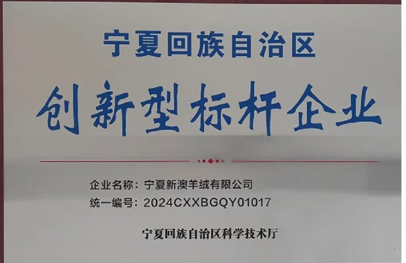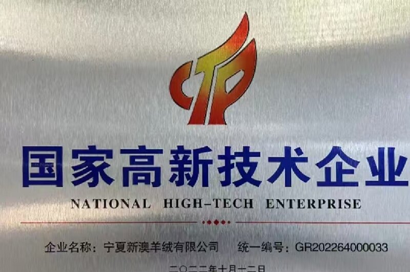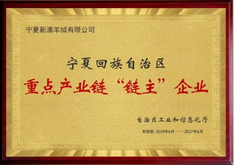 凭借卓越的综合实力,新澳羊绒先后获得国家高新技术企业,自治区羊绒深加工产业链"链主"企业,自治区优秀民营企业,自治区百强民营企业,自治区创新型标杆企业,银川市纺织产业链"链主"企业,自治区专精特新中小企业,自治区绿色工厂,数字化车间等荣誉称号,并获得国际羊毛局特许,可使用纯羊毛标志等。同时,新澳羊绒每年完成HIGG FEM与HIGGFSLM验证,全方位满足全球高端客户需求,持续引领羊绒行业高质量发展。