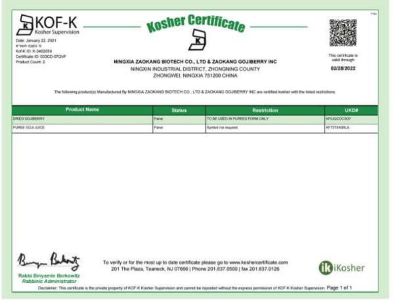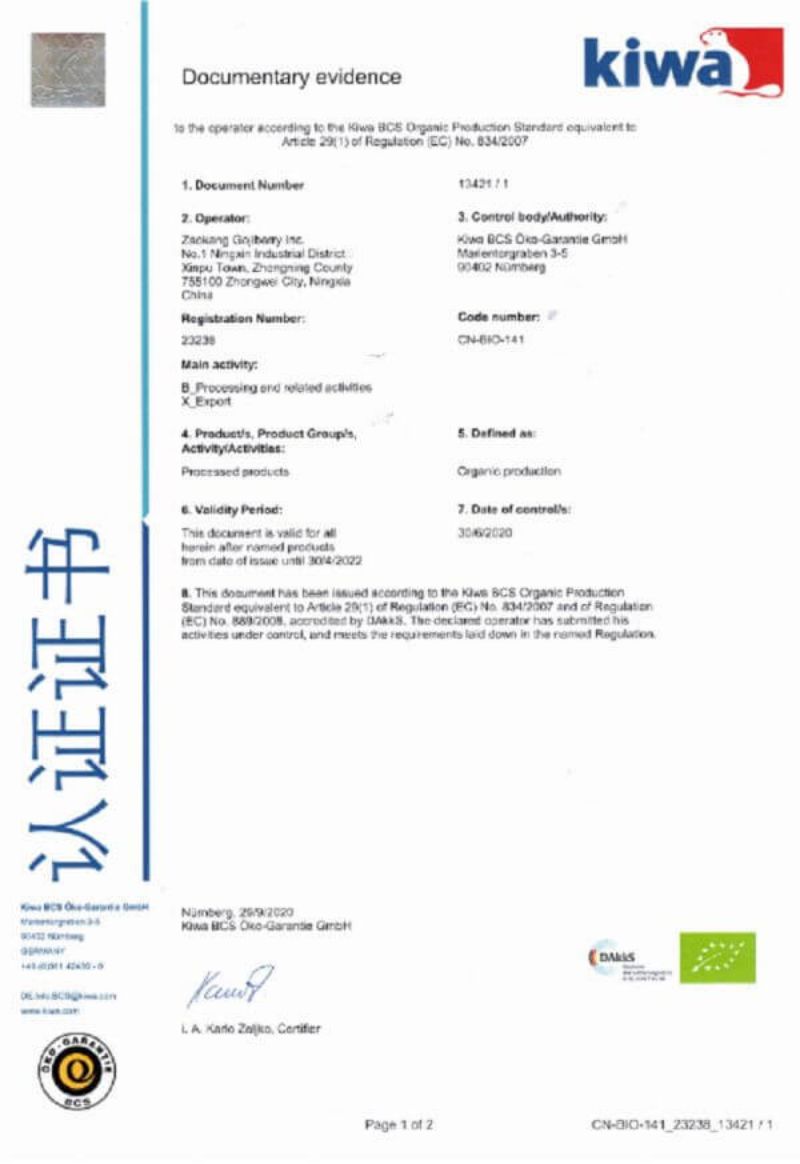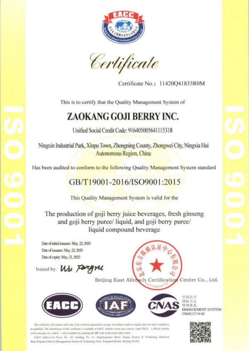 资质认证:美国FDA认证、ISO9001、ISO22000、HACCP、欧盟有机认证、Kosher认证、中宁枸杞认证、中国地理标志认证