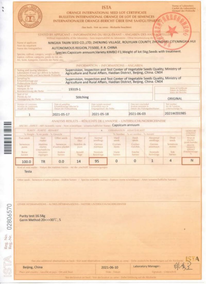 证书样本,由于每批种子获得的认证记录数据不同,以下证书的日期和数据可能不是最新的