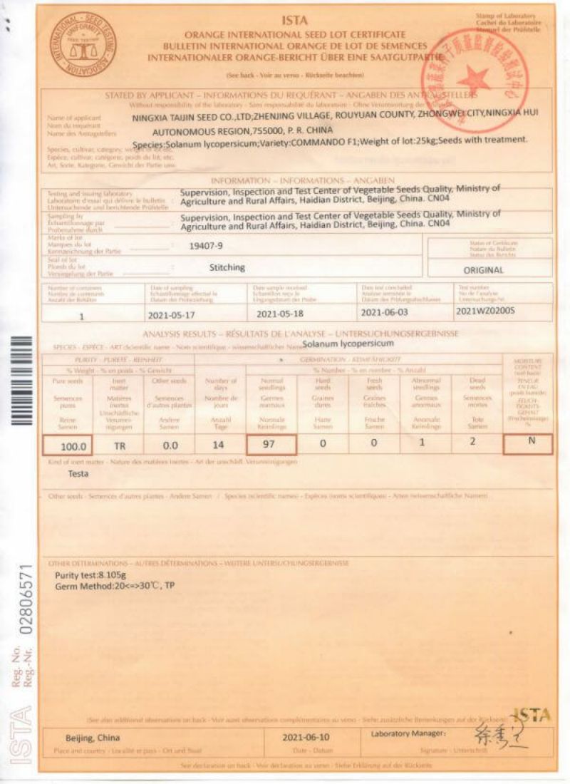 证书样本,由于每批种子获得的认证记录数据不同,以下证书的日期和数据可能不是最新的